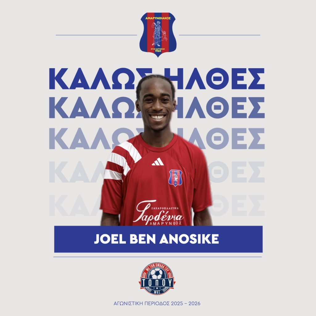 O Joel Ben Anosike, 19 ετών, θα ενισχύσει τον Αμαρυνθιακό στη Γ’ Εθνική. Προέρχεται από την Κ19 της Athens Kallithea (2023-2025), με την οποία την περσινή χρονιά είχε 23 συμμετοχές και 4 γκολ.